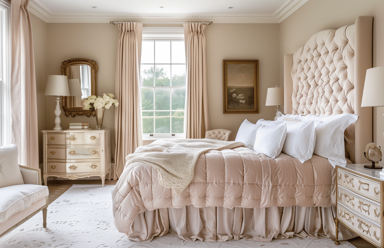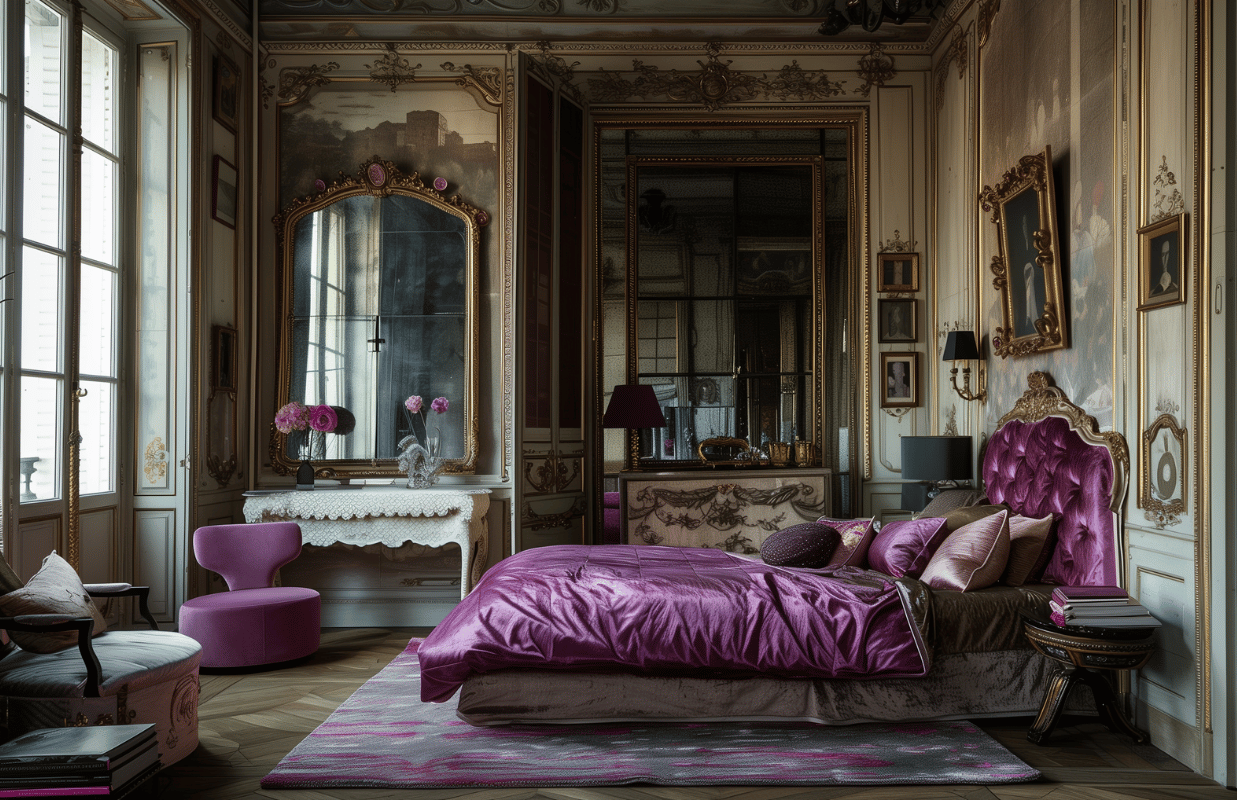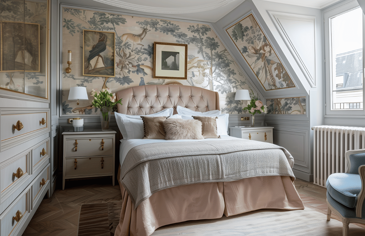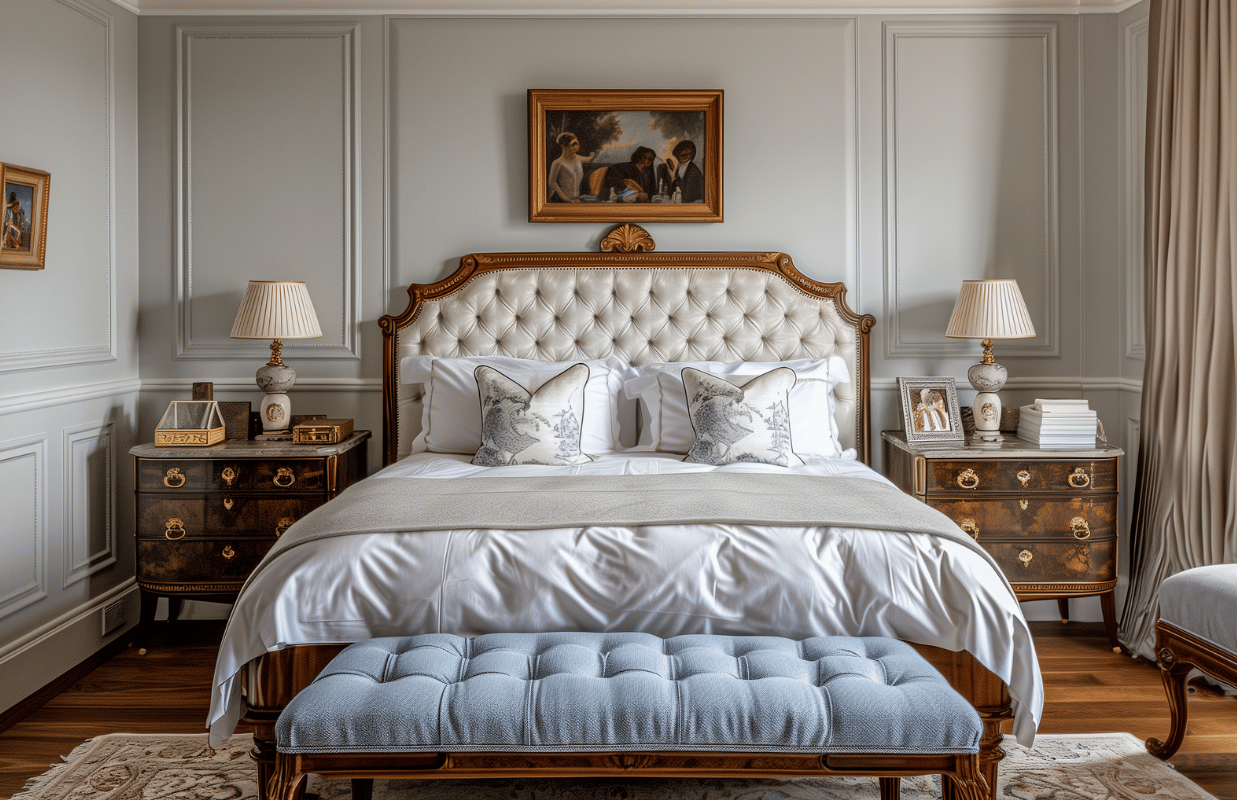 В спальне тоже ценится симметрия силуэтов: в центре стоит большая кровать с высоким изголовьем (может быть даже с балдахином), а над ней — картина. По бокам расположены тумбочки, а над ними — симметричная отделка молдингами и обоями в их рамках и бра. В современной вариации тумбочки уже могут быть разными или быть тумбочкой и комодом.