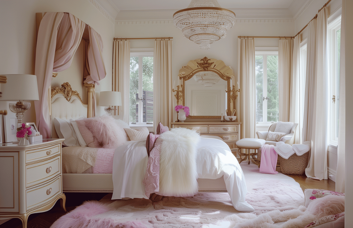 Светлые тона классического стиля идеально подходят для оформления малогабаритной комнаты. Лучше выбирать исключительно белую мебель с небольшим количеством ажурных элементов. Светлые шелковые обои белых, желтых и розовых оттенков отлично подойдут к зоне туалетного столика. А любой настенный декор — зеркала и картины — стоит дополнить подсветкой.