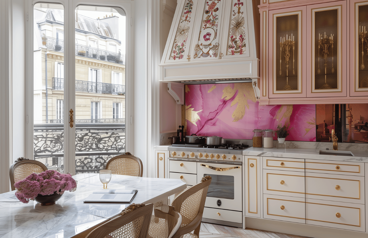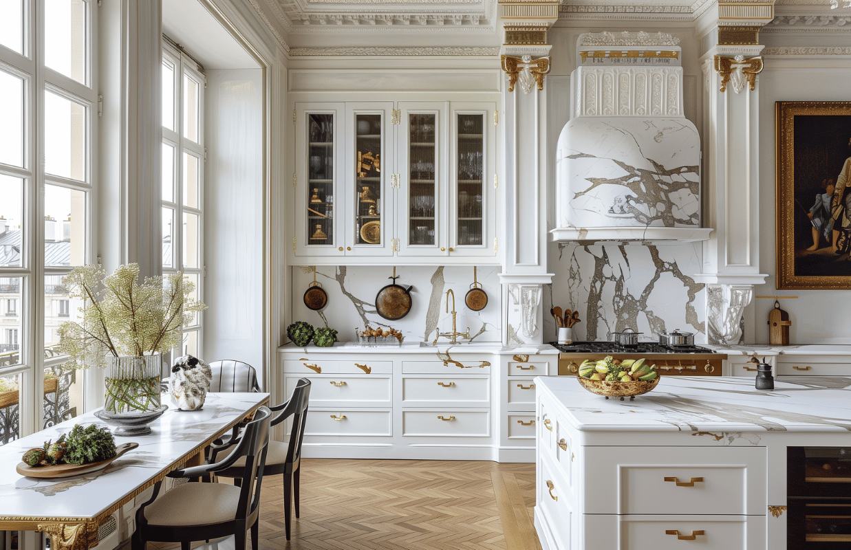 Оформление стен и пола в дизайне интерьера кухни в классическом стиле обычно представлено шелковыми обоями, столешницы и фартук выполнены из натурального мрамора, искусственного камня или керамики под мрамор.