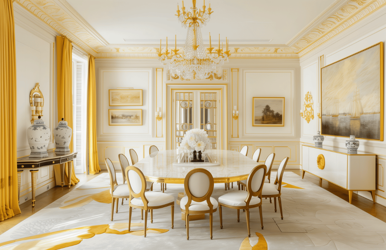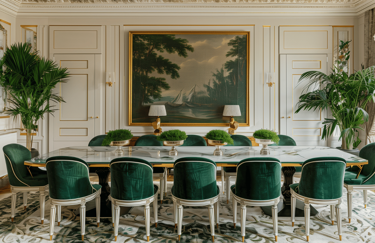 Самые распространенные оттенки для столовой в классическом стиле — бежевые, белые, темно-коричневые и черные древесные. Если у стульев есть мягкое сиденье, оно может иметь как однотонную акцентную (оливковый, розовый, голубой) отделку, так и цветочный принт (розы, пионы) или традиционный геометричный принт (дамаск).