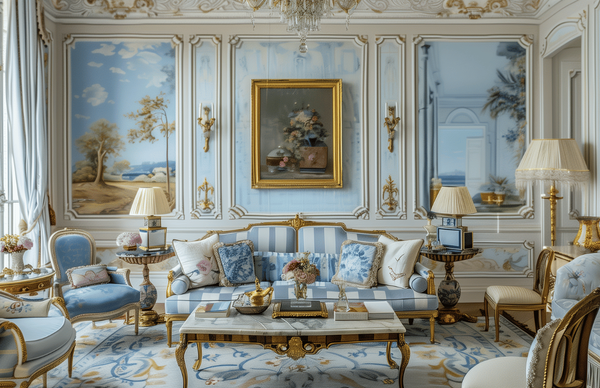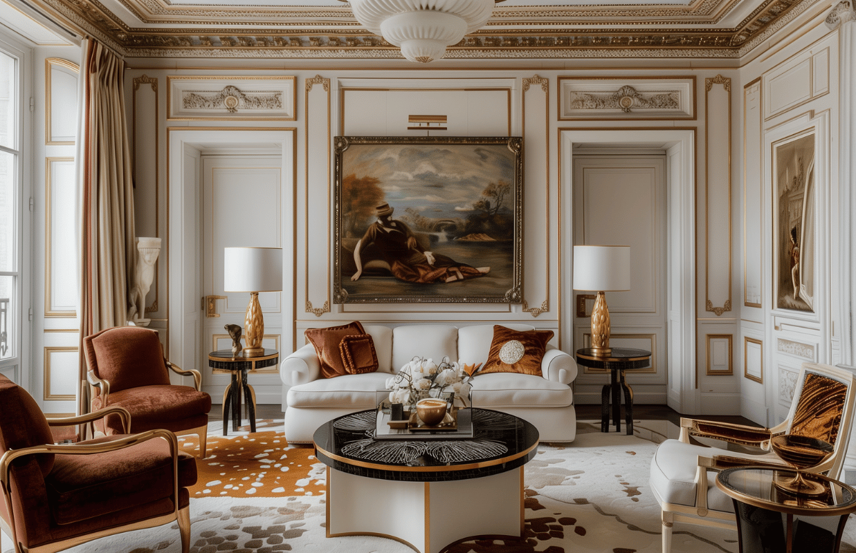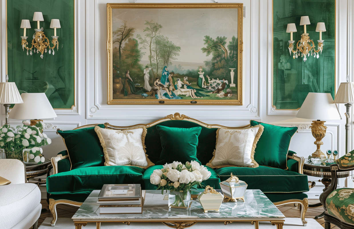Среди декора популярны скульптуры и бюсты, настольные лампы, торшеры и бра, картины (пейзажи и портреты), шкатулки и подносы, вазы, канделябры и подсвечники.