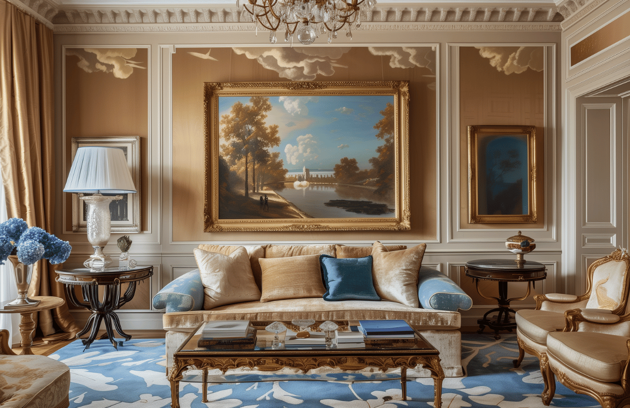 Интерьеры без ярких акцентов, в монохромной бежево-коричневой палитре тоже популярны. Но здесь в виде яркого акцента выступает сусальное золото. В квартирах этот вариант даже более предпочтителен из-за небольшой площади, в то время как в самих дворцах и особняках мы чаще всего видим яркие интерьеры.