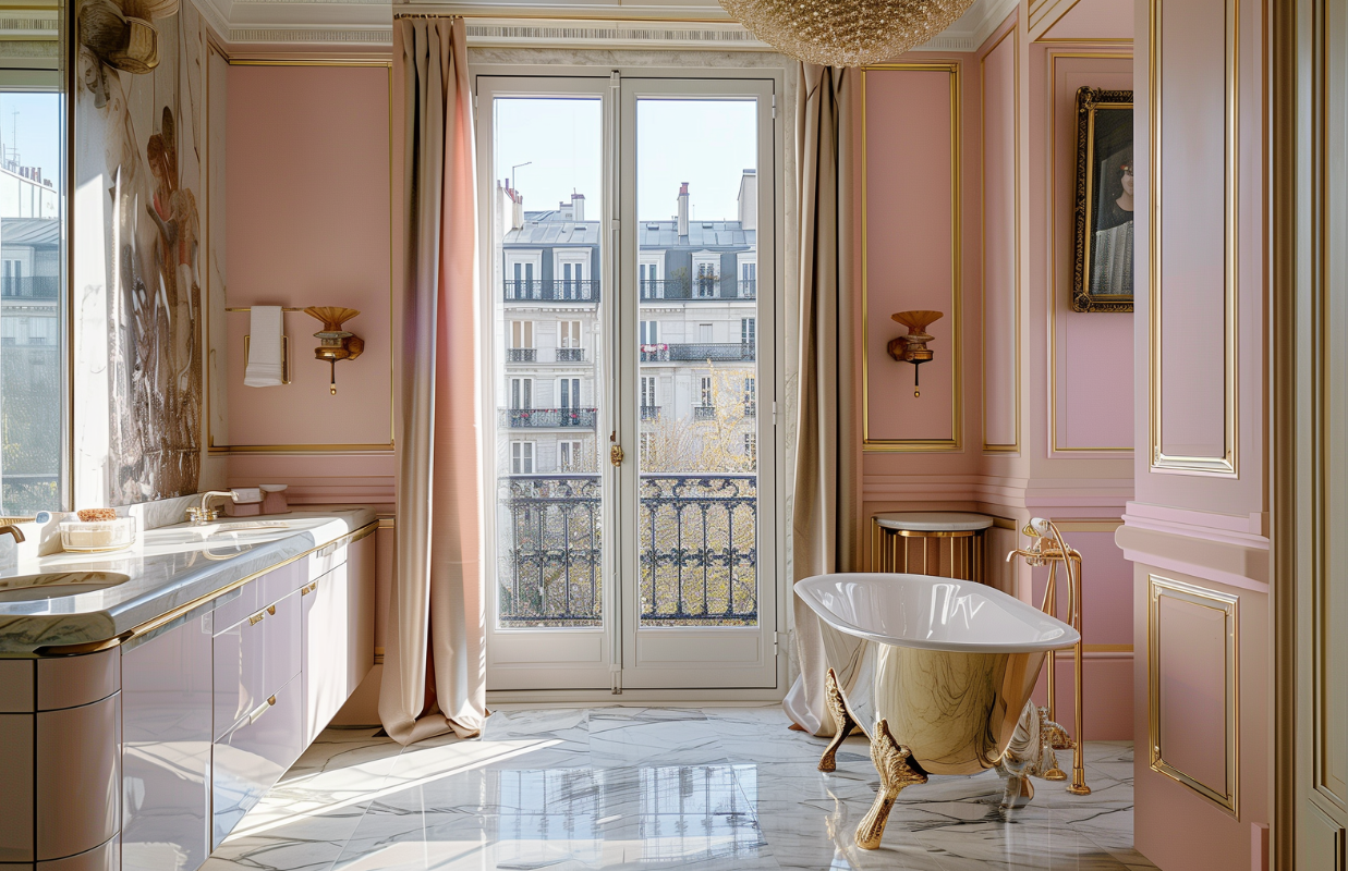 Дом в классическом стиле по дизайну отличается от квартиры именно в интерьере ванной комнаты. Ее площадь здесь обычно в два-четыре раза больше, есть окно или даже французский балкон. Ванная комната по-французски имеет и особенную сантехнику: с классическим или винтажным флером. Обычно она выполнена в традиционном силуэте из стали в оттенках античного, желтого или розового золота или меди.