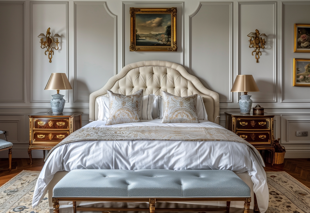 Кровати в стиле неоклассика — это и вовсе апогей изящества и женственности. Традиционно используются мягкая обивка с капитоне и/или резные элементы. Самыми популярными тонами обивки можно назвать бежевый, коричневый, белый, серый и розовый.