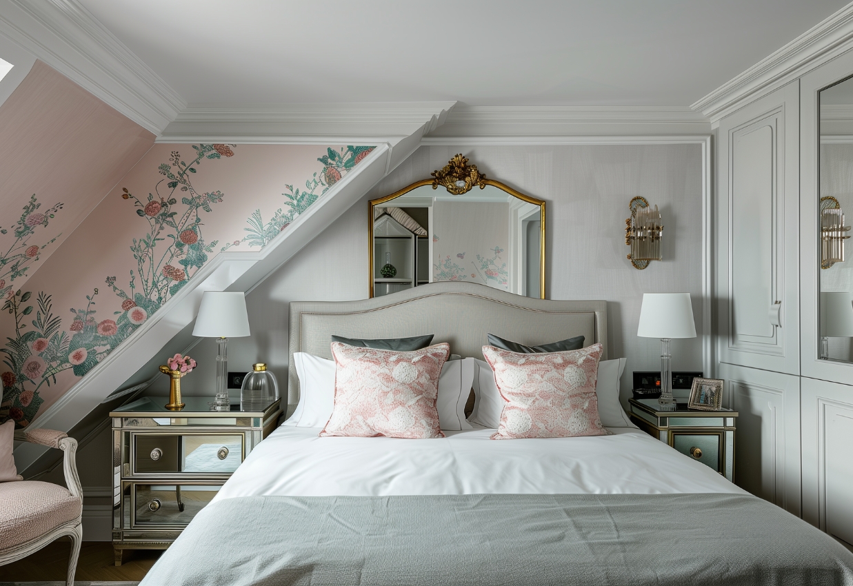 Пастельный интерьер в стиле неоклассика должен быть сбалансирован. Например, для придания строгости и геометричности стоит обязательно использовать на стенах молдинги, контрастные цвету самих стен (например, белые на розовом) либо дополнить образ контрастным к цвету стен изголовьем/диваном. Хорошо в пастельном интерьере смотрится неоклассическая мебель с позолотой (и жестким силуэтом), зеркальная и белая мебель.