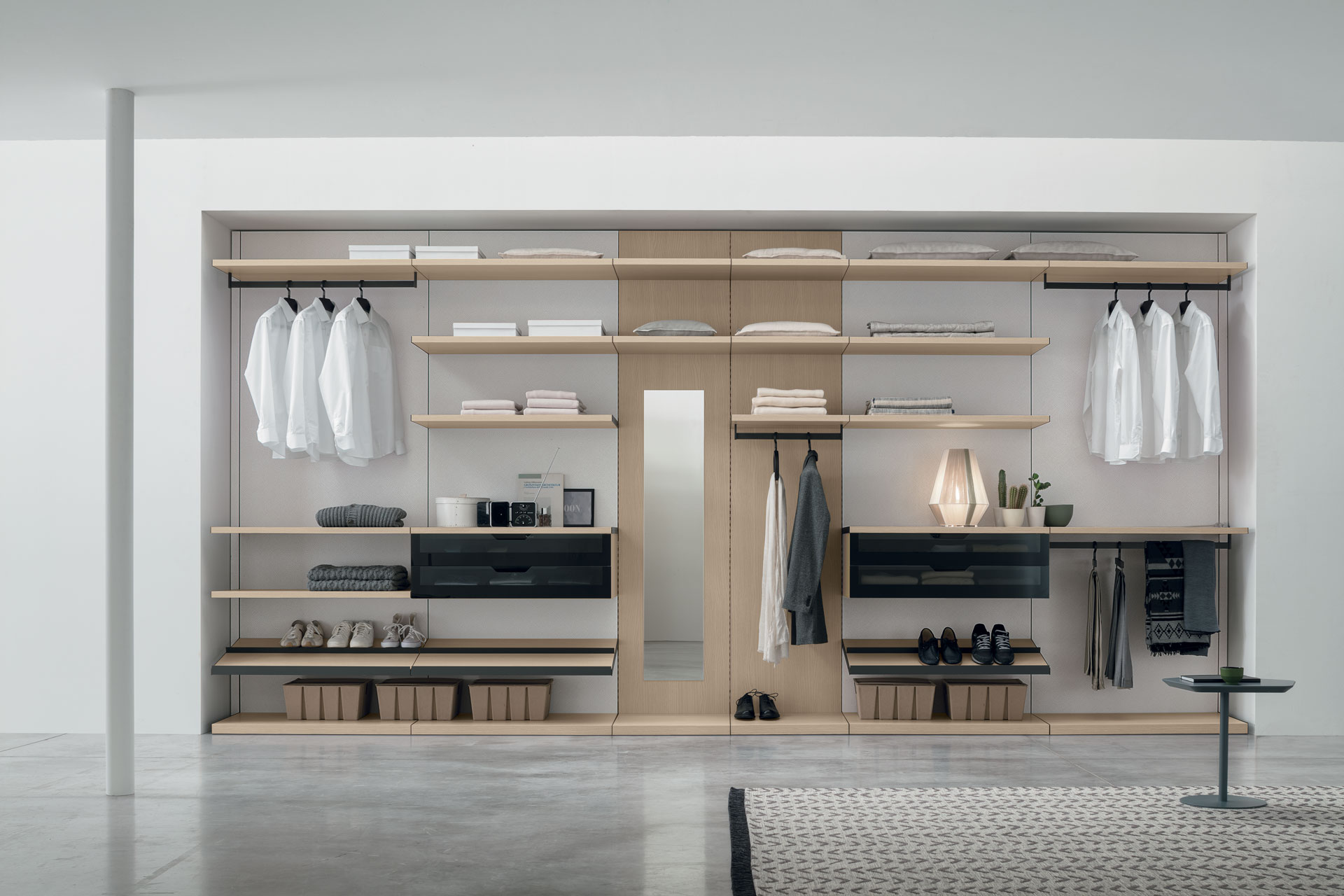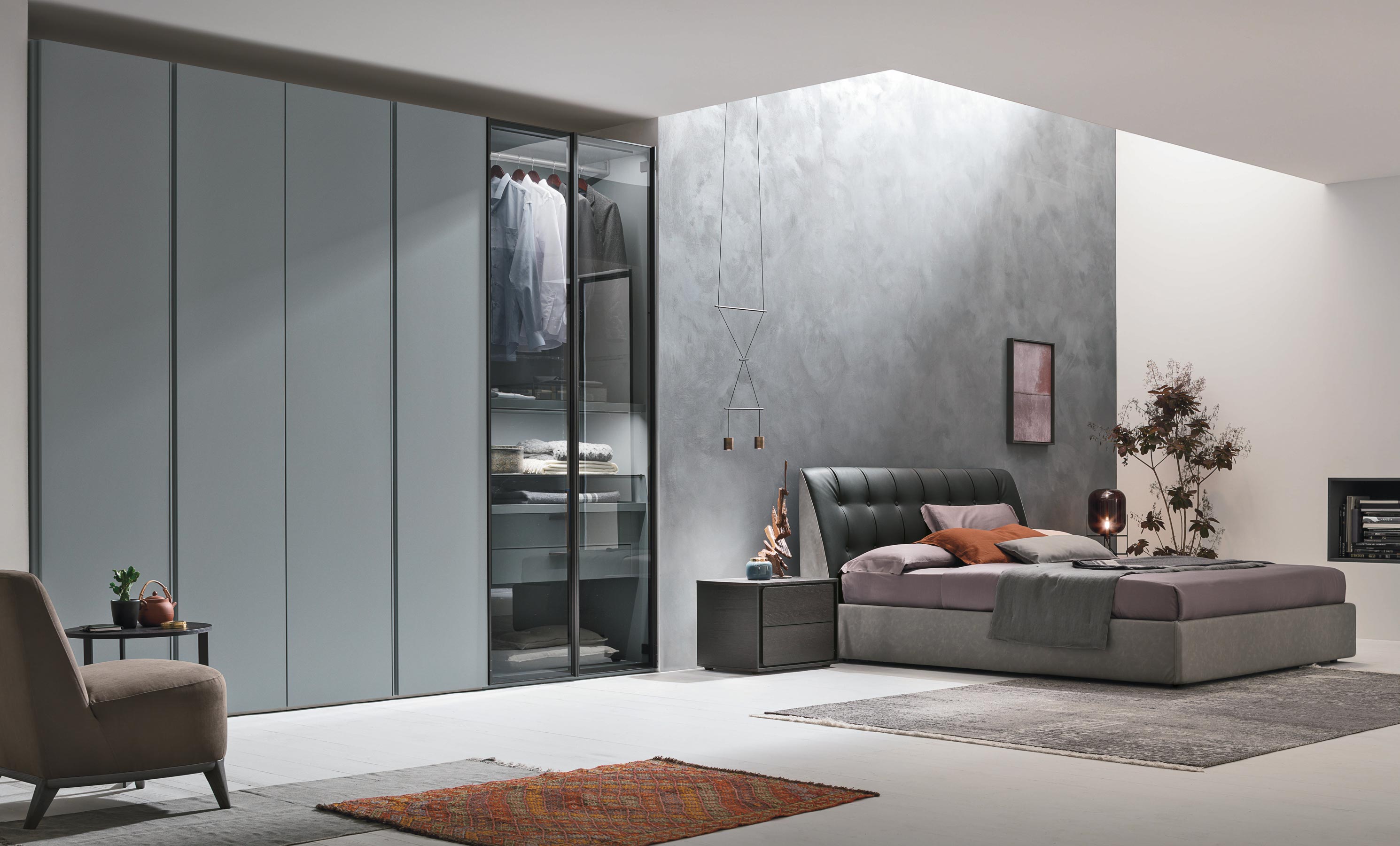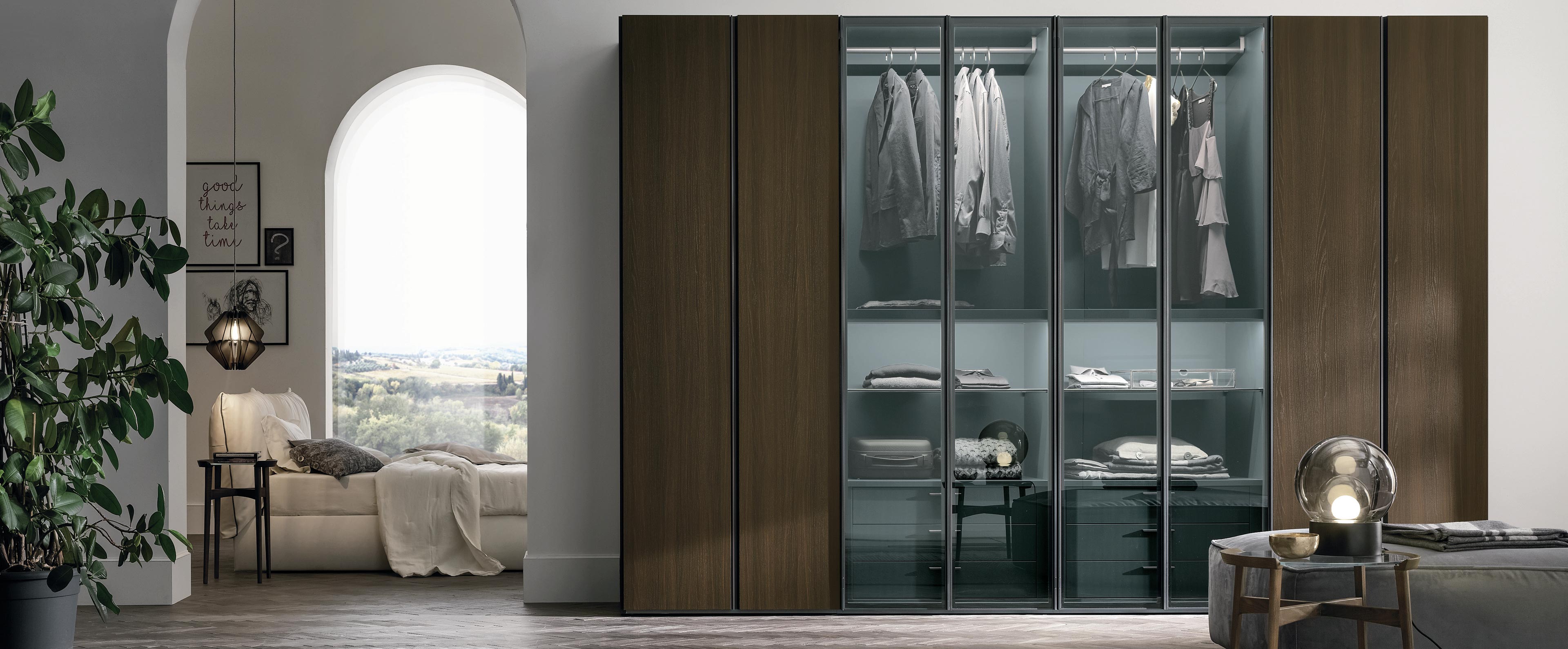 Стекло: Tomasella активно использует стекло в своих коллекциях, особенно для дверей шкафов и фасадов. Применяется как прозрачное, так и тонированное и матовое стекло, что добавляет мебели легкость и изящность. Стеклянные вставки позволяют создать визуально просторные и светлые пространства, что особенно актуально для современных интерьеров.