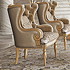 Кресло из массива бука с резными деталями, выполненными вручную. Декоративная подушка и подушка сидения набиты пухом. Фигурные ножки и рамка покрыты сусальным золотом. Спинка декорирована строчкой капитоне (за дополнительную оплату).