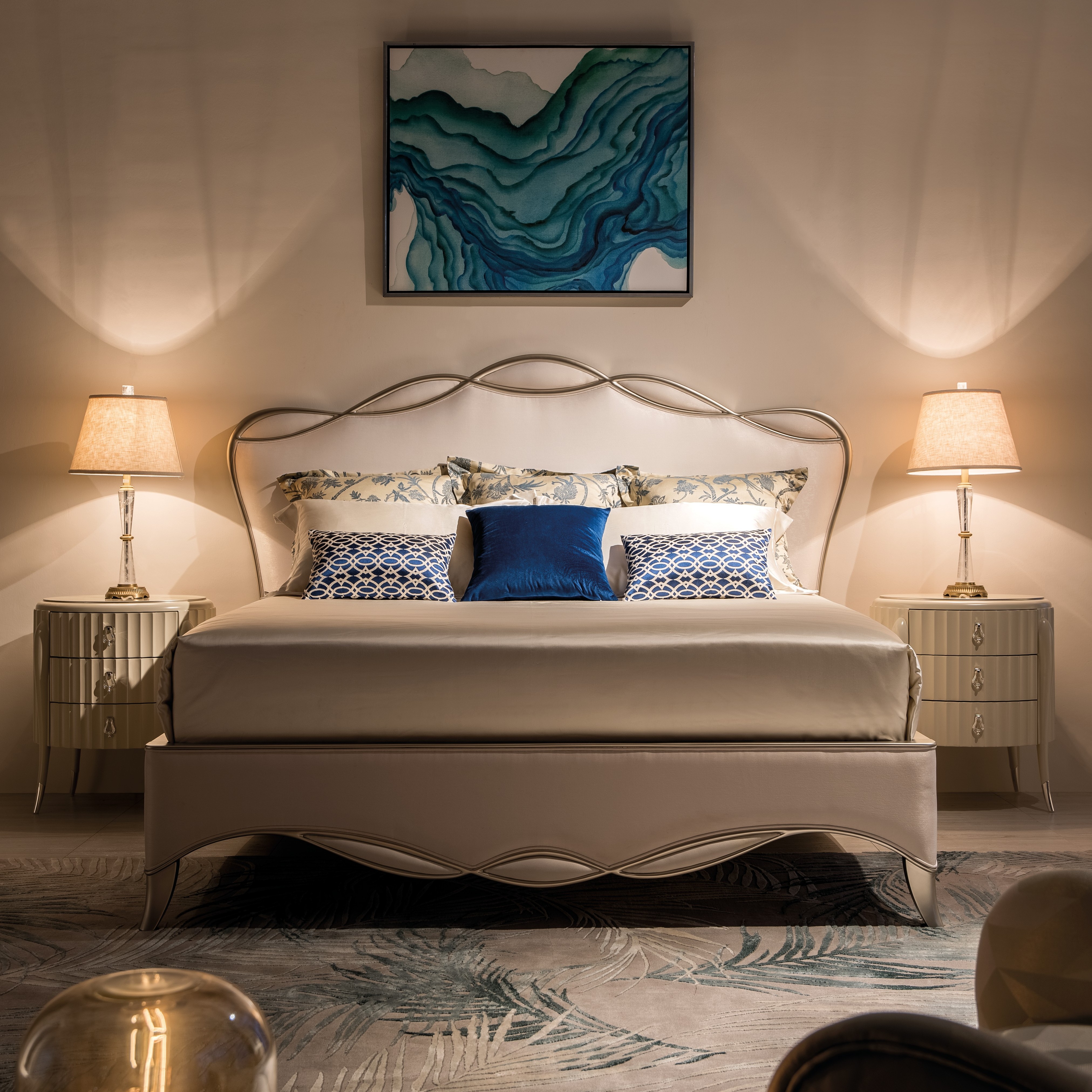 Роскошная кровать на слегка изогнутых ножках, выполненная в стиле ар-деко. Модель изготовлена из высококачественной МДФ высокой плотности и массива дерева. Фигурное изголовье оформлено тканью и декорировано волнообразной отделкой.