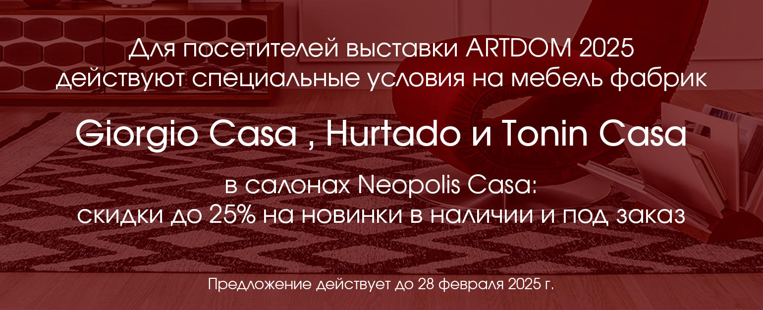 С 20 по 22 февраля в «Крокус Экспо» пройдет международная выставка мебели ARTDOM 2025. Neopolis Casa представит такие бренды, как Giorgio Casa (Италия), Hurtado (Испания) и Tonin Casa (Италия). В наших салонах вы можете приобрести мебель этих фабрик, выбрать изысканные решения для премиальных интерьеров.